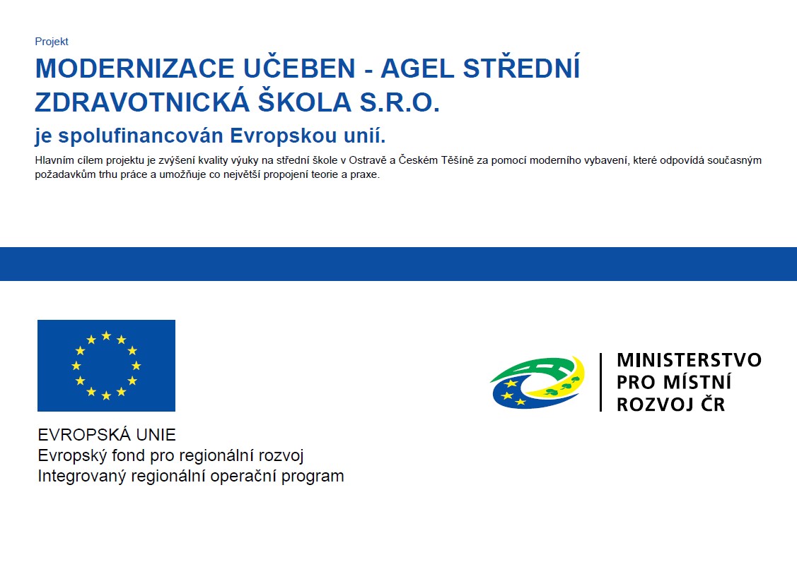 Projekt CZ.06.2.67/0.0/0.0/16_066/0017266 spolufinancovaný z Integrovaného regionálního operačního programu, výzvy č. 21 „ZS ITI Ostrava-IROP-SC 2.4-Střední školy III.“, je zaměřen na zvýšení kvality výuky střední zdravotnické školy AGEL v Ostravě a Českém Těšíně za pomocí moderního vybavení.